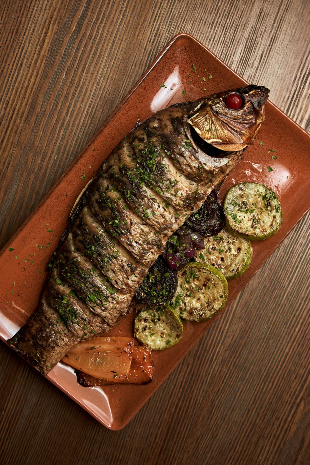 Цельный сазан, тушёный в собственном соку. Подаётся с овощами гриль и соусом на выбор.