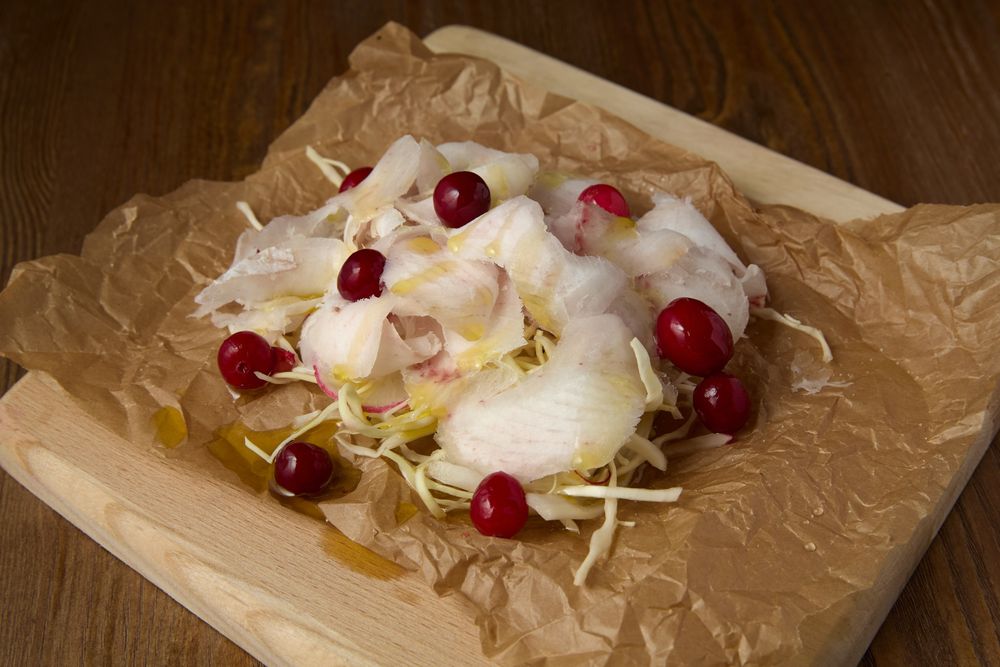 Ледяные слайсы царь-рыбы с салатом из редьки, капусты и мочёной таёжной ягодой. Истинный вкус Севера.