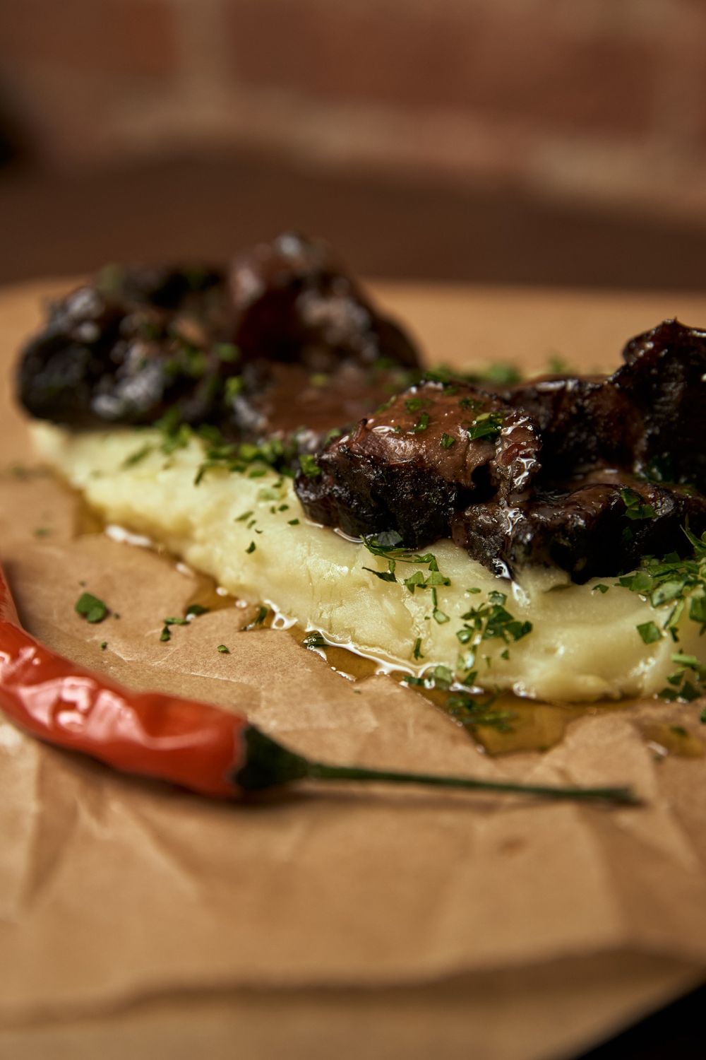 Нежнейшие щёчки, томлёные в печи 3 часа в собственном соку. С картофельным пюре и перчиком чили.