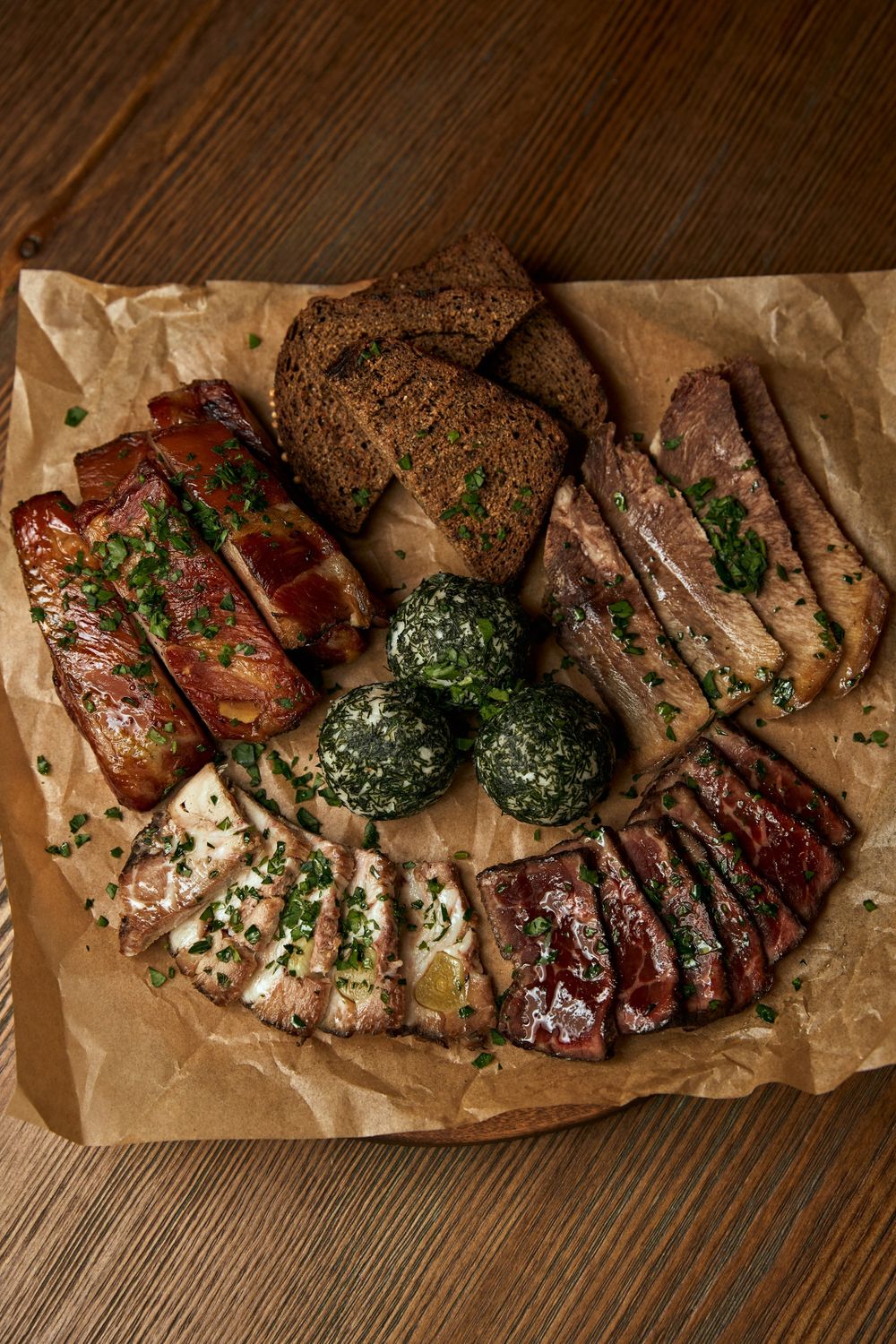 Большое ассорти: нежнейший ростбиф, буженина, язык отварной, смалец, копченые ребра. Подается с поджаренным бородинским хлебом.